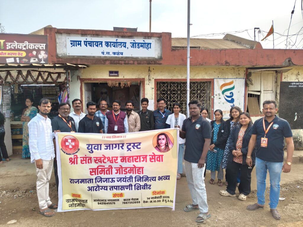 जोडमोहा येथे भव्य आरोग्य शिबीर संपन्न१२२ रुग्णांची मोफत तपासणी व औषधोपचारयुवा जागर ट्रस्ट, संत खटेश्वर महाराज सेवा समिती आणि मुख्यमंत्री सहायता निधी कक्षाचा संयुक्त उपक्रम यवतमाळ/जोडमोहा ग्रामीण भागातील नागरिकांना गावातच अद्ययावत आरोग्य सुविधा मिळाव्यात आणि त्यांच्या आरोग्याच्या तक्रारींचे निवारण व्हावे, या उदात्त हेतूने युवा जागर ट्रस्ट आणि श्री संत खटेश्वर महाराज सेवा समिती, जोडमोहा यांच्या संयुक्त विद्यमाने नुकतेच भव्य आरोग्य शिबिराचे आयोजन करण्यात आले होते. या शिबिरात परिसरातील नागरिकांनी उत्कृष्ट प्रतिसाद नोंदवला.या आरोग्य शिबिराचे विशेष वैशिष्ट्य म्हणजे मुख्यमंत्री सहायता निधी कक्षाच्या माध्यमातून वसंतराव नाईक शासकीय वैद्यकीय महाविद्यालय व रुग्णालय (VNGMC), यवतमाळ येथील तज्ज्ञ डॉक्टरांचे पथक उपलब्ध करून देण्यात आले होते. या तज्ज्ञ डॉक्टरांच्या टीमने शिबिरात आलेल्या रुग्णांची सखोल आरोग्य तपासणी केली.शिबिरात एकूण १२२ गरजू रुग्णांची मोफत आरोग्य तपासणी करण्यात आली. तपासणीनंतर निदान झालेल्या आजारांवर रुग्णांना जागेवरच मोफत गोळ्या व औषधांचे वाटप करण्यात आले. ग्रामीण भागात अशा प्रकारचे शिबीर आयोजित केल्यामुळे अनेक वृद्ध आणि गरजू रुग्णांना मोठा दिलासा मिळाला आहे.शिबिराच्या यशस्वितेसाठी युवा जागर ट्रस्ट किशोर बाभुळकर,करण गेडाम,आणि श्री संत खटेश्वर महाराज सेवा समितीचेकार्यकर्ते आनंद जैस्वाल, पंकज भोयर,पवन धोत्रे, प्रवीण ढाकूलकर, बंडू वाघाडे, प्रशांत भोयर,सचिन चंदनकर पवन जाधव, नीलेश जुनघरे,अक्षय टेकाम. ऋषभ दिघोरे , राधे मसराम, अभी कुंभारे,रोहित बंधाते,जयपाल वाघाडे इत्यादी नी विशेष परिश्रम घेतले. उपस्थितांनी या सामाजिक उपक्रमाचे भरभरून कौतुक केले.